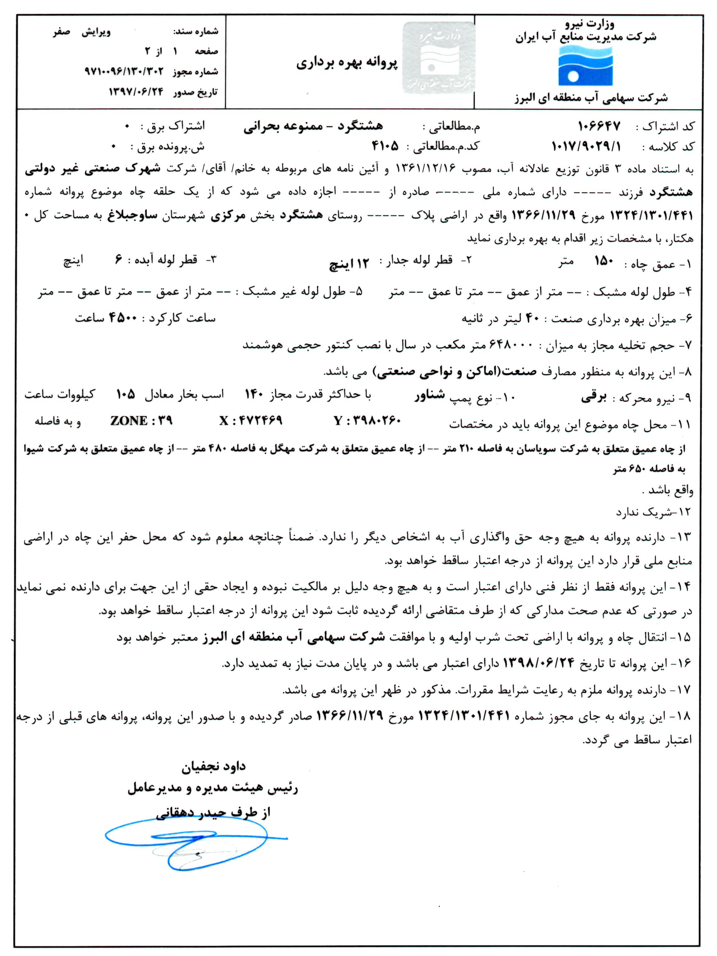 صدور پروانه بهره برداری چاه آب شماره یک بعد از 25 سال به نام شهرک صنعتی غیر دولتی هشتگرد